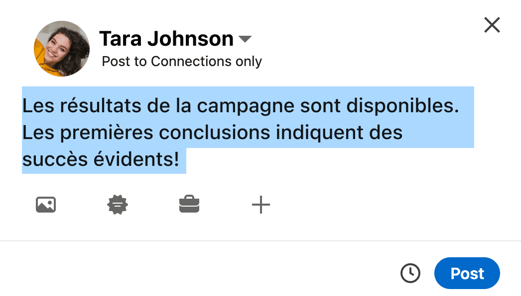 Rédigez d’abord en français, puis traduisez en anglais avant d’envoyer.